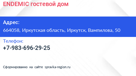 ENDEMIC, гостевой дом по адресу 664058, Иркутская область, Иркутск, Вампилова, 50 в дальнейшем Организация, размещена в следующих категориях: