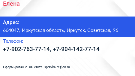 Елена по адресу 664047, Иркутская область, Иркутск, Советская, 96 в дальнейшем Организация, размещена в следующих категориях: