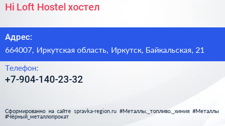 Hi Loft Hostel, хостел по адресу 664007, Иркутская область, Иркутск, Байкальская, 21 в дальнейшем Организация, размещена в следующих категориях: