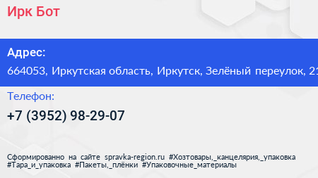 Ирк-Бот по адресу 664053, Иркутская область, Иркутск, Зелёный переулок, 21 в дальнейшем Организация, размещена в следующих категориях:
