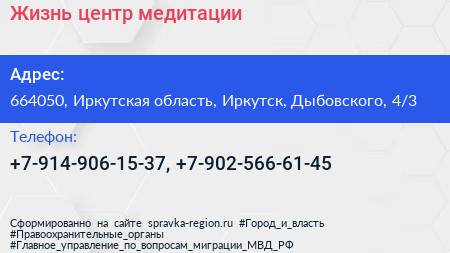 Жизнь, центр медитации по адресу 664050, Иркутская область, Иркутск, Дыбовского, 4/3 в дальнейшем Организация, размещена в следующих категориях: