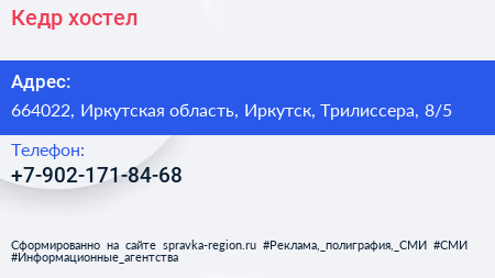 Кедр, хостел по адресу 664022, Иркутская область, Иркутск, Трилиссера, 8/5 в дальнейшем Организация, размещена в следующих категориях: