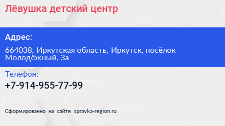 Лёвушка, детский центр по адресу 664038, Иркутская область, Иркутск, посёлок Молодёжный, 3а в дальнейшем Организация, размещена в следующих категориях: