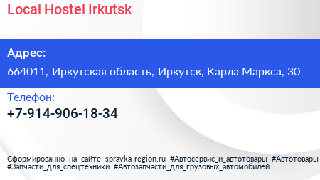 Local Hostel Irkutsk по адресу 664011, Иркутская область, Иркутск, Карла Маркса, 30 в дальнейшем Организация, размещена в следующих категориях: