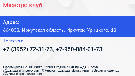 Маэстро, клуб по адресу 664003, Иркутская область, Иркутск, Урицкого, 18 в дальнейшем Организация, размещена в следующих категориях: