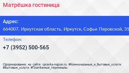 Матрёшка, гостиница по адресу 664007, Иркутская область, Иркутск, Софьи Перовской, 31 в дальнейшем Организация, размещена в следующих категориях: