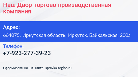 Наш Двор, торгово-производственная компания по адресу 664075, Иркутская область, Иркутск, Байкальская, 200а в дальнейшем Организация, размещена в следующих категориях: