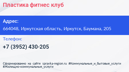 Пластика, фитнес-клуб по адресу 664048, Иркутская область, Иркутск, Баумана, 205 в дальнейшем Организация, размещена в следующих категориях: