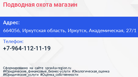 Подводная охота, магазин по адресу 664056, Иркутская область, Иркутск, Академическая, 27/1 в дальнейшем Организация, размещена в следующих категориях: