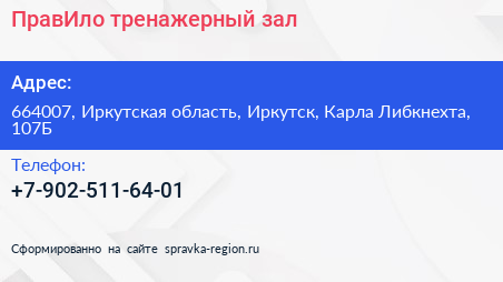ПравИло, тренажерный зал по адресу 664007, Иркутская область, Иркутск, Карла Либкнехта, 107Б в дальнейшем Организация, размещена в следующих категориях: