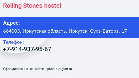 Rolling Stones hostel по адресу 664003, Иркутская область, Иркутск, Сухэ-Батора, 17 в дальнейшем Организация, размещена в следующих категориях: