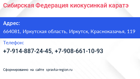 Сибирская Федерация киокусинкай каратэ по адресу 664081, Иркутская область, Иркутск, Красноказачья, 119 в дальнейшем Организация, размещена в следующих категориях: