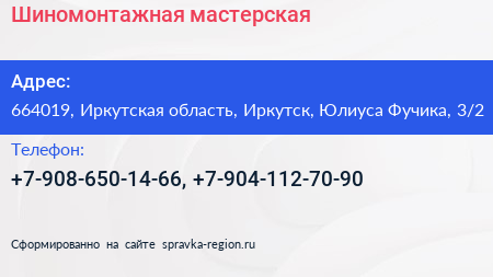 Шиномонтажная мастерская по адресу 664019, Иркутская область, Иркутск, Юлиуса Фучика, 3/2 в дальнейшем Организация, размещена в следующих категориях: