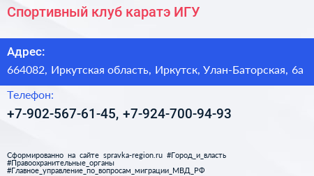 Спортивный клуб каратэ, ИГУ по адресу 664082, Иркутская область, Иркутск, Улан-Баторская, 6а в дальнейшем Организация, размещена в следующих категориях: