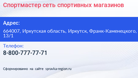 Спортмастер, сеть спортивных магазинов по адресу 664007, Иркутская область, Иркутск, Франк-Каменецкого, 13/1 в дальнейшем Организация, размещена в следующих категориях: