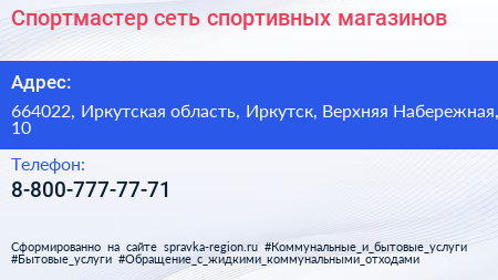 Спортмастер, сеть спортивных магазинов по адресу 664022, Иркутская область, Иркутск, Верхняя Набережная, 10 в дальнейшем Организация, размещена в следующих категориях:
