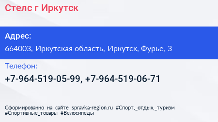 Стелс, г. Иркутск по адресу 664003, Иркутская область, Иркутск, Фурье, 3 в дальнейшем Организация, размещена в следующих категориях: