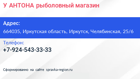 У АНТОНА, рыболовный магазин по адресу 664035, Иркутская область, Иркутск, Челябинская, 25/6 в дальнейшем Организация, размещена в следующих категориях: