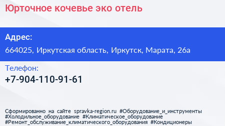 Юрточное кочевье, эко-отель по адресу 664025, Иркутская область, Иркутск, Марата, 26а в дальнейшем Организация, размещена в следующих категориях: