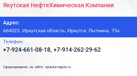 Якутская НефтеХимическая Компания по адресу 664023, Иркутская область, Иркутск, Лыткина, 75а в дальнейшем Организация, размещена в следующих категориях: