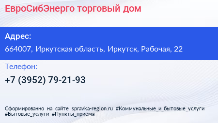 ЕвроСибЭнерго, торговый дом по адресу 664007, Иркутская область, Иркутск, Рабочая, 22 в дальнейшем Организация, размещена в следующих категориях:
