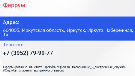 Феррум по адресу 664005, Иркутская область, Иркутск, Иркута Набережная, 1а в дальнейшем Организация, размещена в следующих категориях: