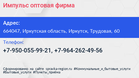 Импульс, оптовая фирма по адресу 664047, Иркутская область, Иркутск, Трудовая, 60 в дальнейшем Организация, размещена в следующих категориях: