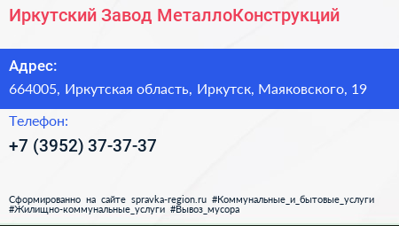 Иркутский Завод МеталлоКонструкций по адресу 664005, Иркутская область, Иркутск, Маяковского, 19 в дальнейшем Организация, размещена в следующих категориях: