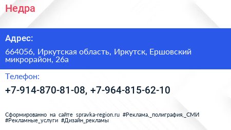 Недра по адресу 664056, Иркутская область, Иркутск, Ершовский микрорайон, 26а в дальнейшем Организация, размещена в следующих категориях: