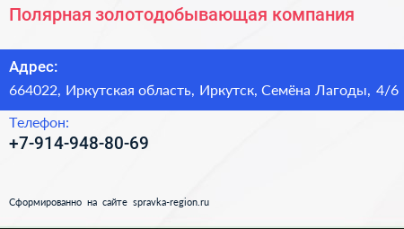 Полярная, золотодобывающая компания по адресу 664022, Иркутская область, Иркутск, Семёна Лагоды, 4/6 в дальнейшем Организация, размещена в следующих категориях: