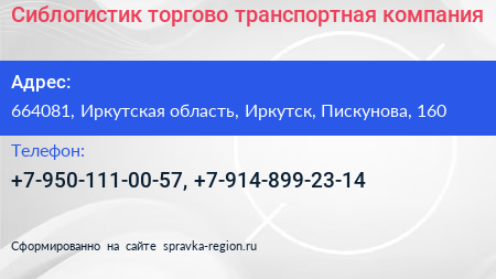 Сиблогистик, торгово-транспортная компания по адресу 664081, Иркутская область, Иркутск, Пискунова, 160 в дальнейшем Организация, размещена в следующих категориях: