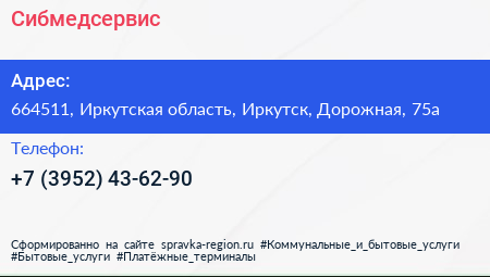 Сибмедсервис по адресу 664511, Иркутская область, Иркутск, Дорожная, 75а в дальнейшем Организация, размещена в следующих категориях: