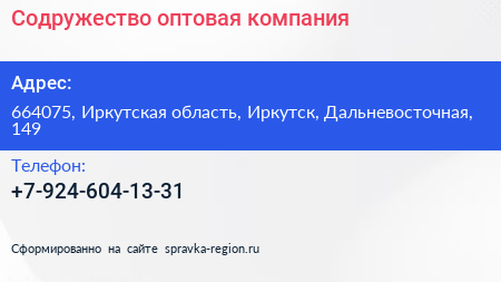 Содружество, оптовая компания по адресу 664075, Иркутская область, Иркутск, Дальневосточная, 149 в дальнейшем Организация, размещена в следующих категориях: