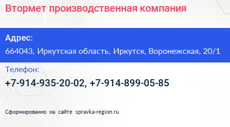 Втормет, производственная компания по адресу 664043, Иркутская область, Иркутск, Воронежская, 20/1 в дальнейшем Организация, размещена в следующих категориях: