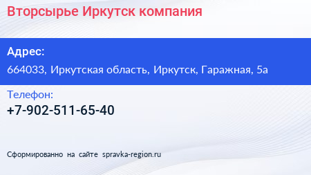 Вторсырье Иркутск, компания по адресу 664033, Иркутская область, Иркутск, Гаражная, 5а в дальнейшем Организация, размещена в следующих категориях:
