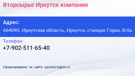 Вторсырье Иркутск, компания по адресу 664040, Иркутская область, Иркутск, станция Горка, 8/6а в дальнейшем Организация, размещена в следующих категориях:
