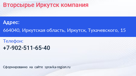 Вторсырье Иркутск, компания по адресу 664040, Иркутская область, Иркутск, Тухачевского, 15 в дальнейшем Организация, размещена в следующих категориях: