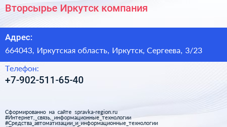 Вторсырье Иркутск, компания по адресу 664043, Иркутская область, Иркутск, Сергеева, 3/23 в дальнейшем Организация, размещена в следующих категориях: