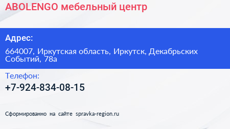 ABOLENGO, мебельный центр по адресу 664007, Иркутская область, Иркутск, Декабрьских Событий, 78а в дальнейшем Организация, размещена в следующих категориях: