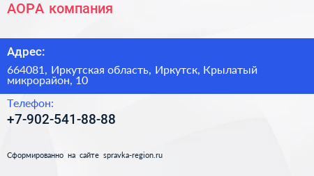 АОРА, компания по адресу 664081, Иркутская область, Иркутск, Крылатый микрорайон, 10 в дальнейшем Организация, размещена в следующих категориях: