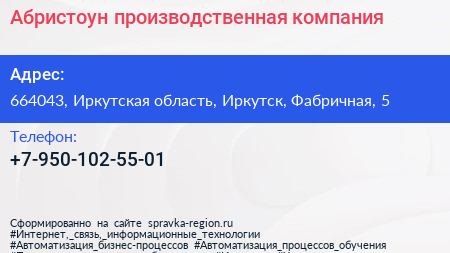 Абристоун, производственная компания по адресу 664043, Иркутская область, Иркутск, Фабричная, 5 в дальнейшем Организация, размещена в следующих категориях: