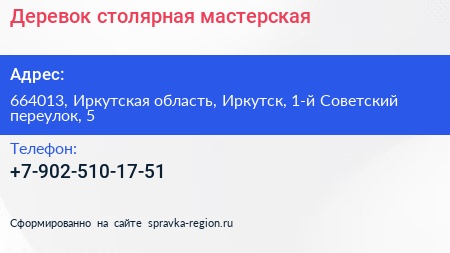 Деревок, столярная мастерская по адресу 664013, Иркутская область, Иркутск, 1-й Советский переулок, 5 в дальнейшем Организация, размещена в следующих категориях: