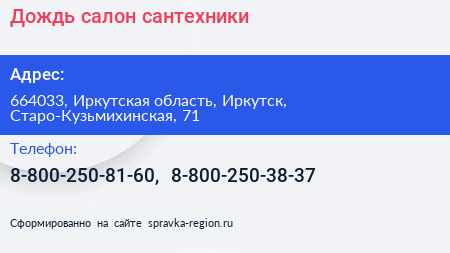 Дождь, салон сантехники по адресу 664033, Иркутская область, Иркутск, Старо-Кузьмихинская, 71 в дальнейшем Организация, размещена в следующих категориях: