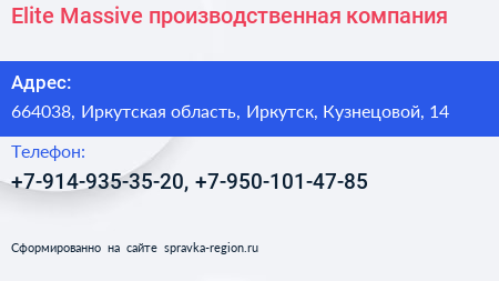 Elite Massive, производственная компания по адресу 664038, Иркутская область, Иркутск, Кузнецовой, 14 в дальнейшем Организация, размещена в следующих категориях: