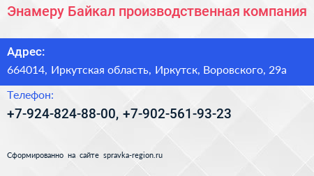 Энамеру-Байкал, производственная компания по адресу 664014, Иркутская область, Иркутск, Воровского, 29а в дальнейшем Организация, размещена в следующих категориях: