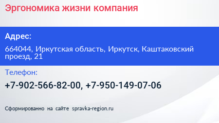 Эргономика жизни, компания по адресу 664044, Иркутская область, Иркутск, Каштаковский проезд, 21 в дальнейшем Организация, размещена в следующих категориях: