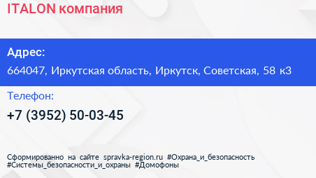 ITALON, компания по адресу 664047, Иркутская область, Иркутск, Советская, 58 к3 в дальнейшем Организация, размещена в следующих категориях: