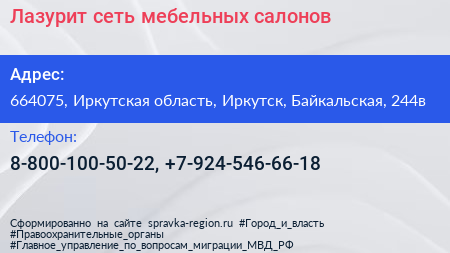 Лазурит, сеть мебельных салонов по адресу 664075, Иркутская область, Иркутск, Байкальская, 244в в дальнейшем Организация, размещена в следующих категориях: