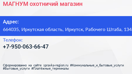МАГНУМ, охотничий магазин по адресу 664035, Иркутская область, Иркутск, Рабочего Штаба, 134 в дальнейшем Организация, размещена в следующих категориях: