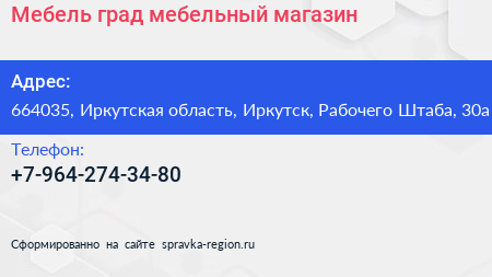 Мебель град, мебельный магазин по адресу 664035, Иркутская область, Иркутск, Рабочего Штаба, 30а в дальнейшем Организация, размещена в следующих категориях: